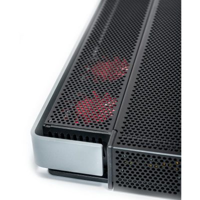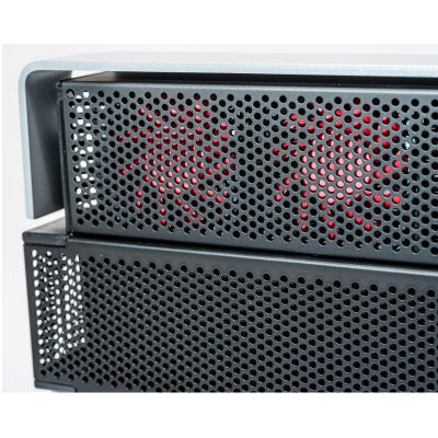 Bagved det sidder to store røde blæsere der evt kan give ekstra køling i tilfælde af en nødsituation. Kredsløbet er klasse AB på de første fire kanaler som forventet, og klasse D til baskanalen.