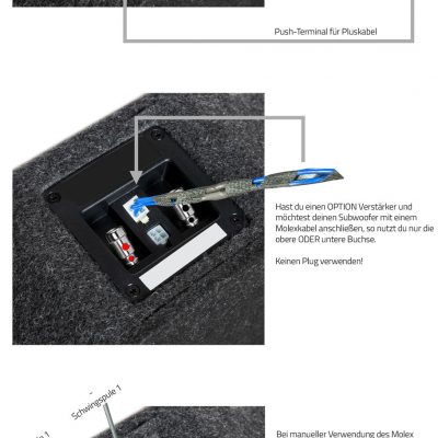 Installationen af DRIVE-10Flat BRP D2 er enkel og pladsbesparende, da subwooferen er specielt udviklet til montering i reservehjulsbrønden. Den kan installeres manuelt med højttalerkabler med løse ender eller via plug & play ved brug af vores Molex-forlænger (MO-2.75-150GW).